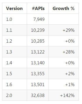 Table showing each version of the .NET Standard and the API counts for them