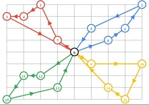 Node zero — the black circle in the centre — represents the office which will be the starting point for all the drivers, as well as the drop-off for all employees. Note that the diagram illustrates the shortest overall amount of time it takes to pick up the employees.